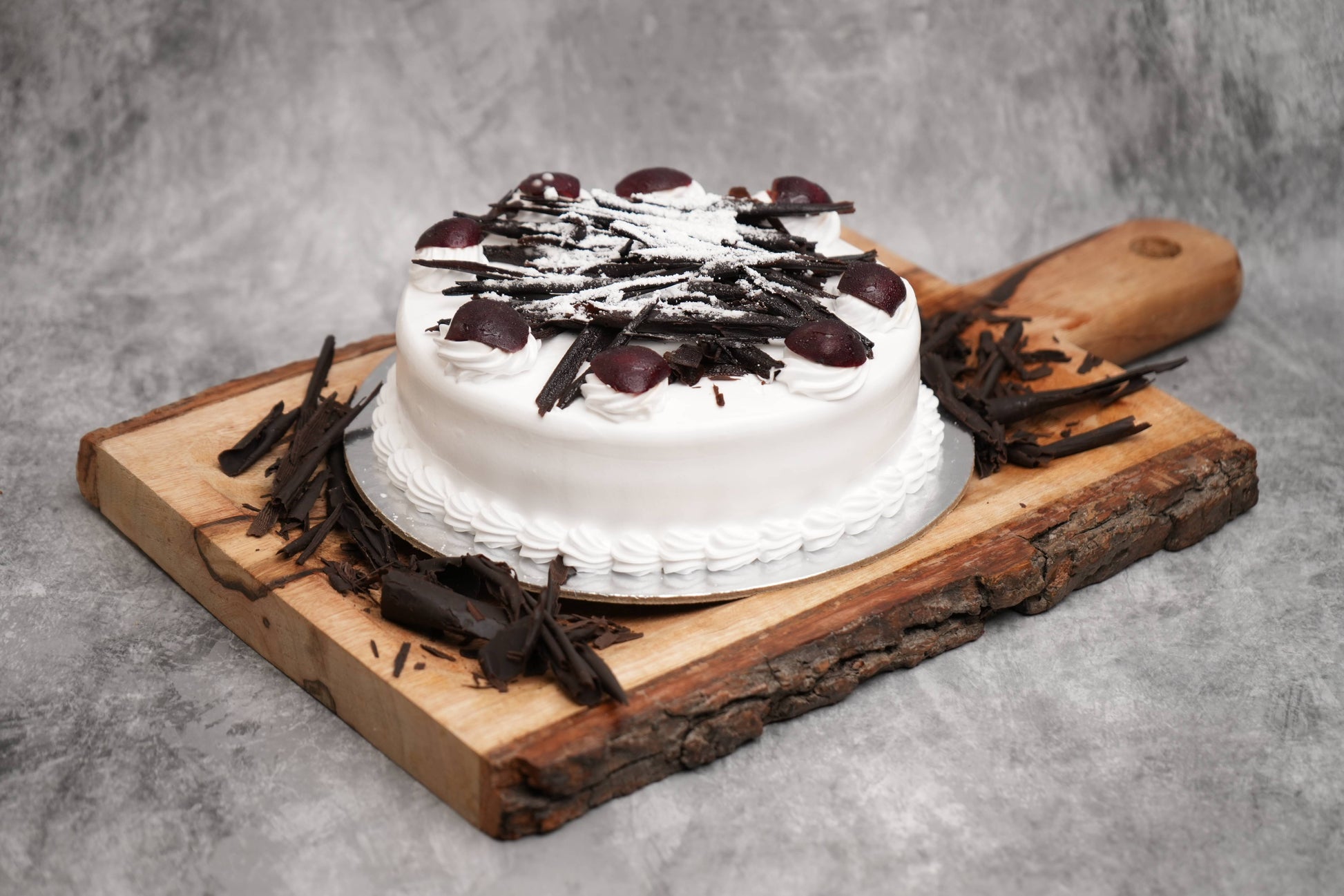 Black forest cake, cherry jam, topped with cream and chocolate.